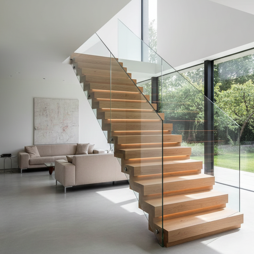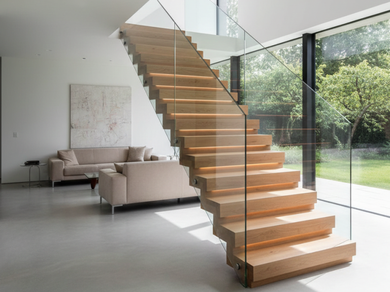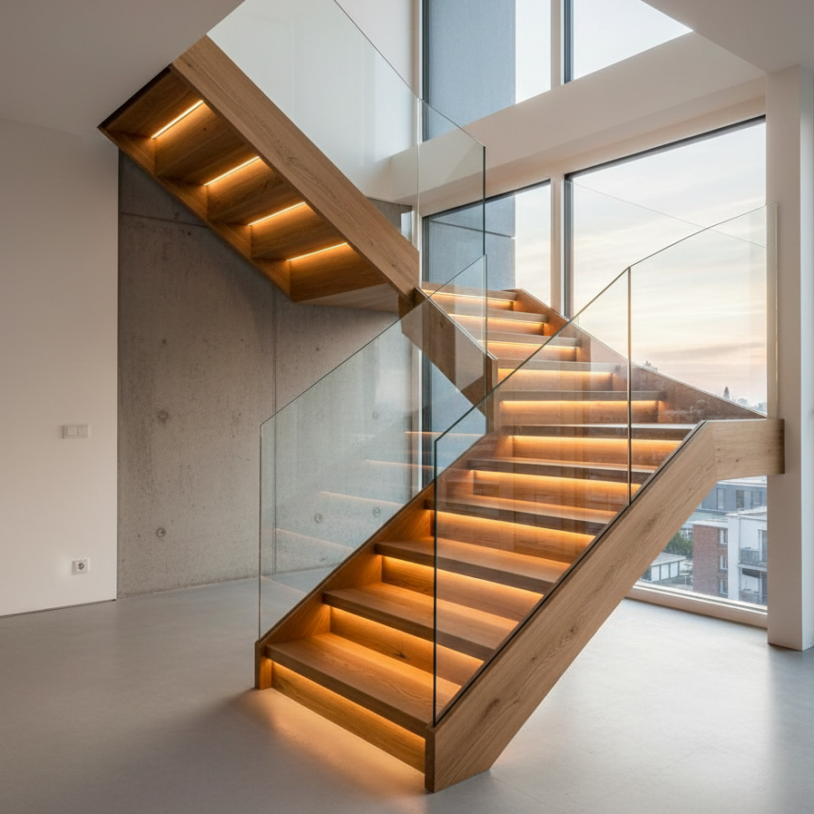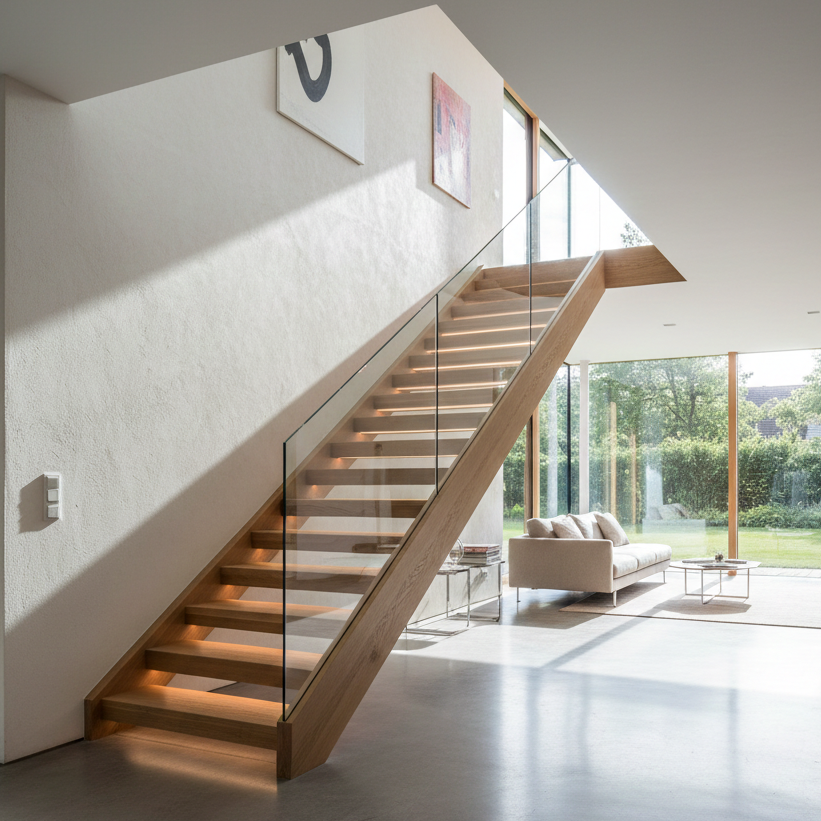 - Platzsparend und geschlossen: Da es sich um eine geschlossene Treppenform handelt, entsteht unter der Treppe ein ruhiger, abgeschlossener Raum (oft als Stauraum nutzbar), ohne dass die Treppe dabei wuchtig wirkt.