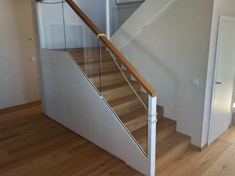 Das Glasgeländer, genutet in die weiß lackierten Wangen, bietet nicht nur optimale Sicherheit, sondern sorgt auch für ein luftiges und offenes Raumgefühl. Als Brüstung ist das Glas genutet in der weiß lackierten Deckenblende, was für eine nahtlose Integration und ein ästhetisch ansprechendes Gesamtbild sorgt.
