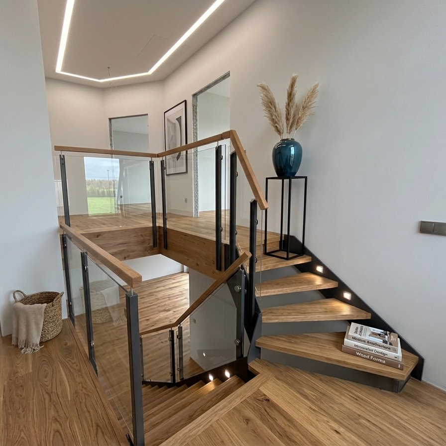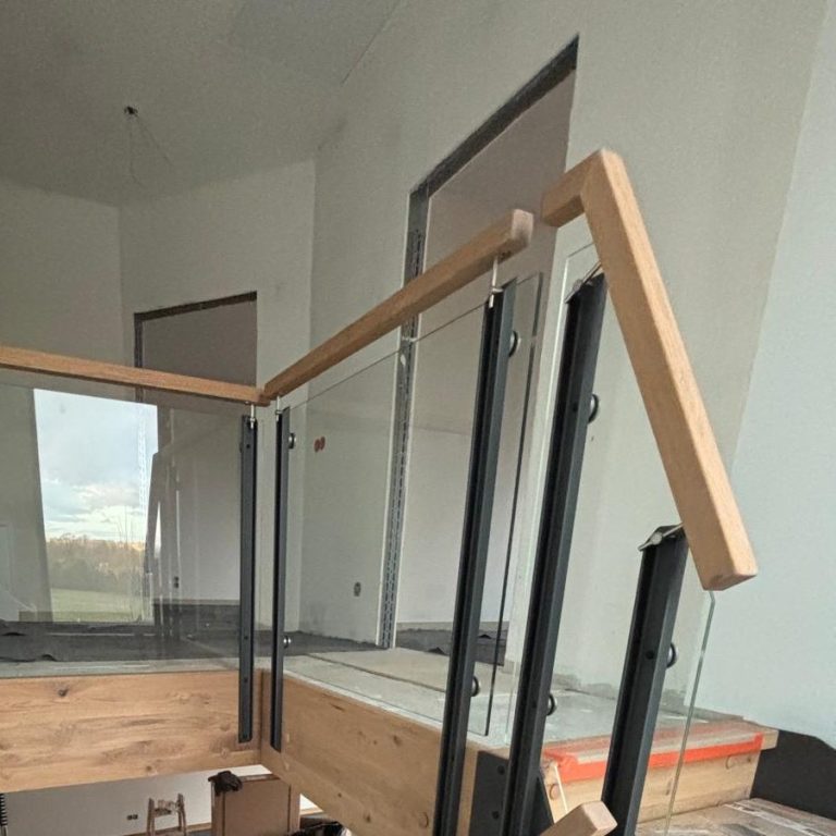 Holzhandlauf als Akzent: Ein schlanker Handlauf aus Eiche bildet den oberen Abschluss des Geländers und liegt angenehm warm in der Hand.